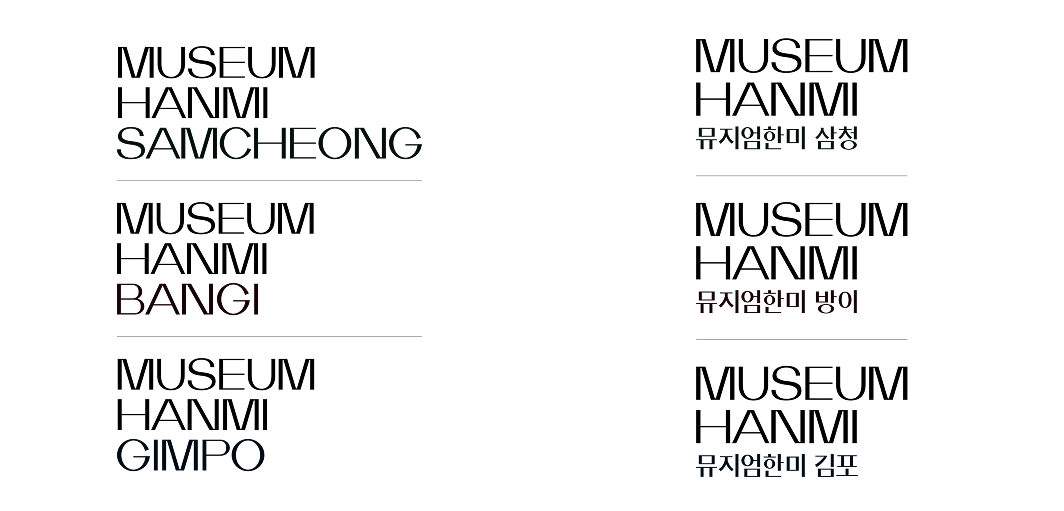 뮤지엄한미 삼청, 뮤지엄한미 방이, 뮤지엄한미 김포로 운영되는 뮤지엄한미의 3관 체제의 특성에 따라 각 관들을 표현할 수 있는 영문 시그니처와 국영문 상하조합 시그니처를 구성하였습니다. 온,오프라인의 다양한 매체에 적용하여 사용이 가능하며 국문 영문의 동시 사용이 필요한 대내외적 행사 및 인쇄 제작물에서 사용합니다.
