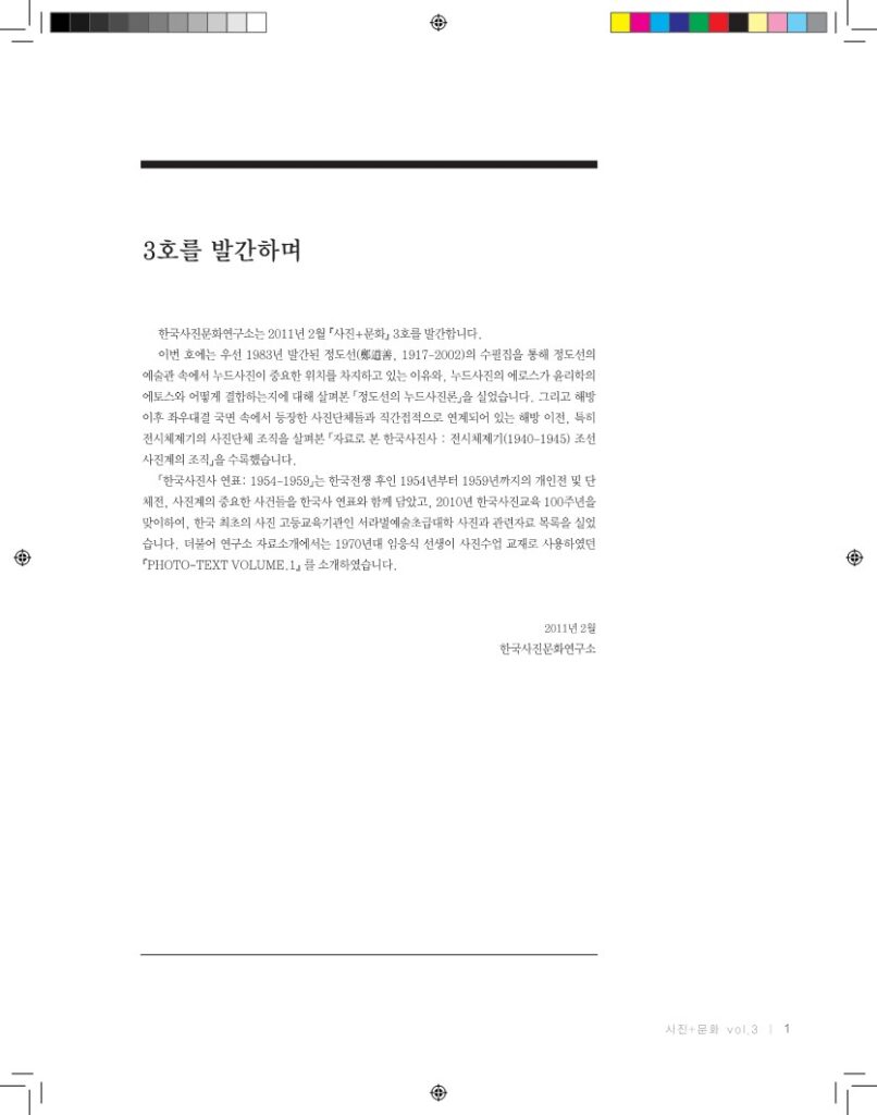 『사진+문화』는 한국사진문화연구소에서 연 1회 발행하는 기관지로 한국사진사 관련 자료를 공유하고 연구소의 프로젝트를 소개하기 위해 기획되었습니다.