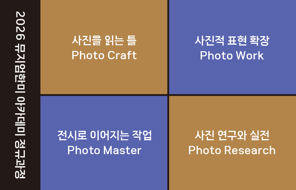 2026 뮤지엄한미 아카데미 정규과정은 ‘Photo Craft’, ‘Photo Work’, ‘Photo Master’를 거쳐 개인전을 목표로 작가 능력을 함양하는 사진연구반 ‘Photo Research’까지의 단계적 과정을 소수 정원제로 운영합니다.