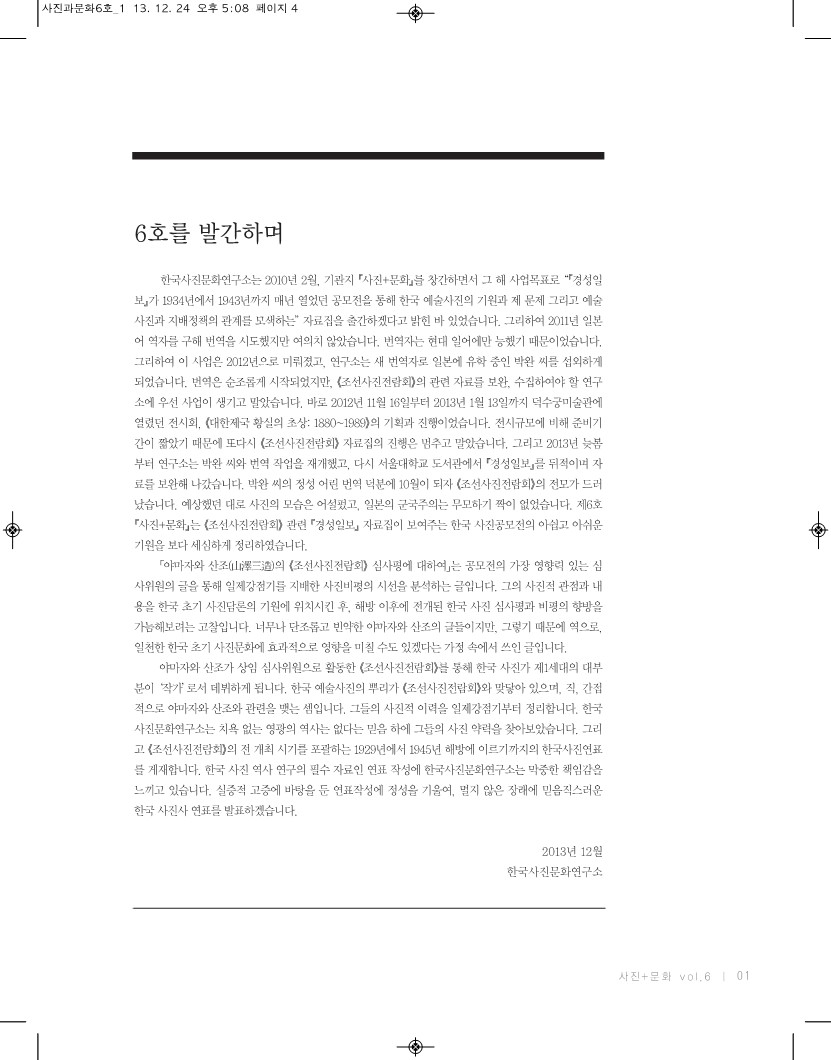 『사진+문화』는 한국사진문화연구소에서 연 1회 발행하는 기관지로 한국사진사 관련 자료를 공유하고 연구소의 프로젝트를 소개하기 위해 기획되었습니다.