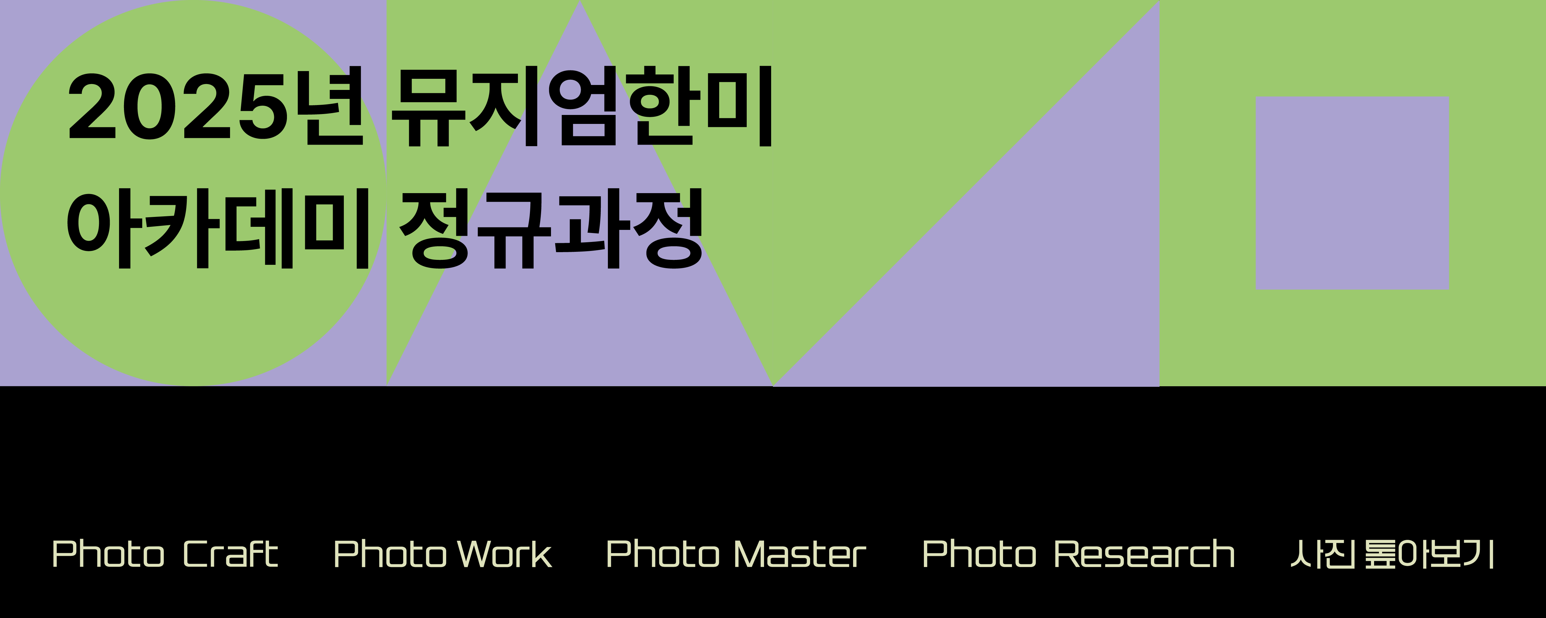 2025 뮤지엄한미 아카데미 정규과정은 ‘Photo Craft’, ‘Photo Work’, ‘Photo Master’를 거쳐 개인전을 목표로 작가 능력을 함양하는 사진연구반 ‘Photo Research’까지의 단계적 과정을 소수 정원제로 운영합니다. 그리고 위의 단계적 과정을 이론적으로 보충하는 ‘사진 톺아보기’ 강좌를 신설합니다.