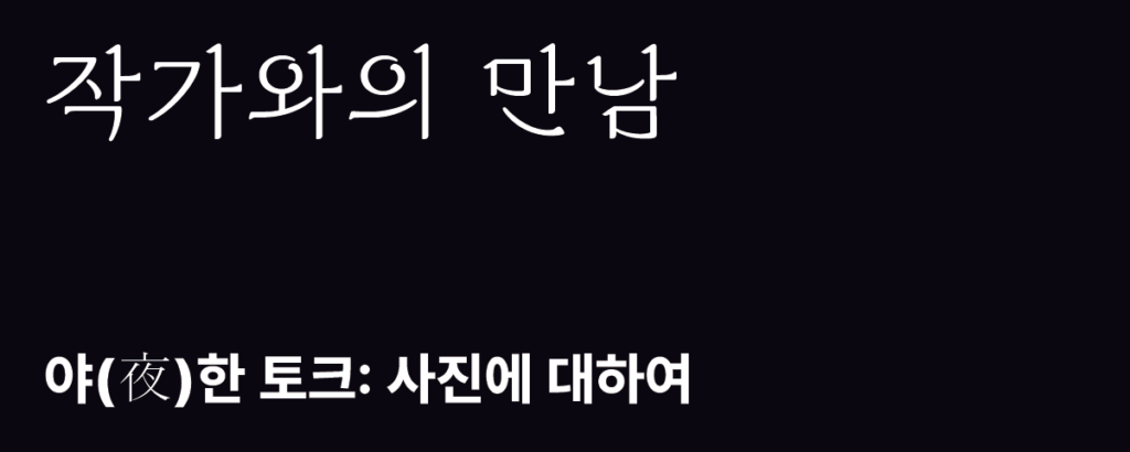 12월 6일 진행하는 〈야(夜)한 토크: 사진에 대하여〉는 작가와 함께 사진·예술과 관련된 대화를 자유롭게 나눠보는 시간입니다. 작가와 함께 와인과 간단한 음식들을 즐기며 그동안 궁금했던, 혹은 나누고 싶었던 사진에 관한 이야기를 편안한 분위기의 미술관 속에서 마음껏 대화해보는 프로그램입니다.